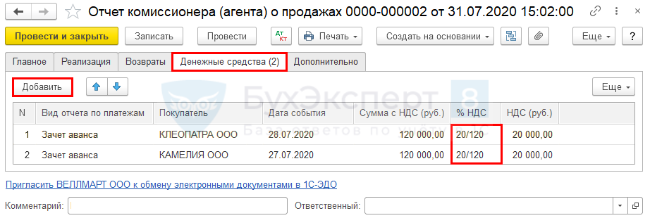 - 27 июля — ООО «Камелия» на сумму 120 000 руб. (в т. ч. НДС 20%);