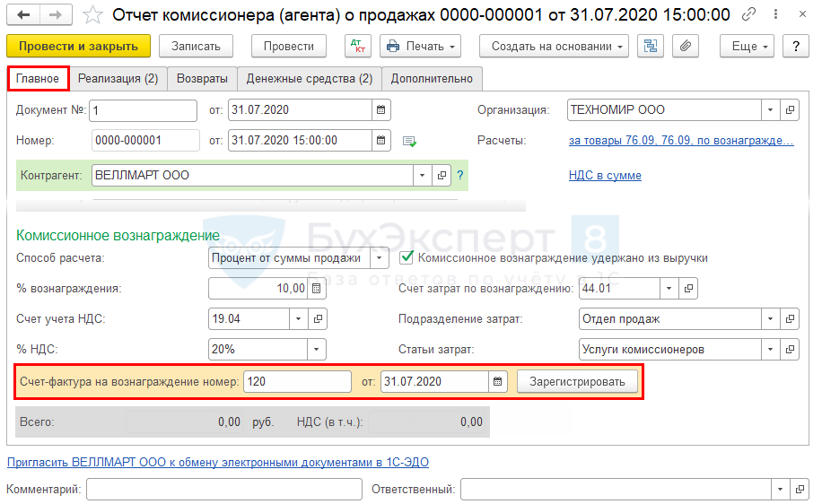 Здесь же зарегистрируйте счет-фактуру комиссионера, выставленный на вознаграждение.