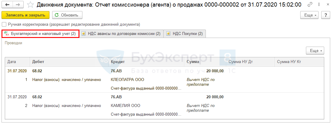 По условиям примера в отчете комиссионера есть данные об авансах: