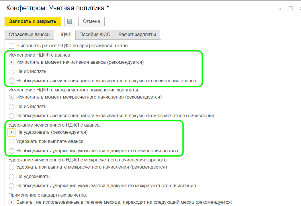 – Учетная политика и другие настройки – Учетная политика – НДФЛ). Эти настройки действуют, если выбран способ расчета аванса – Расчетом за первую половину месяца.