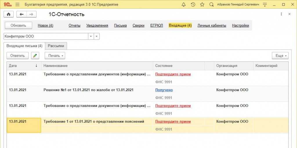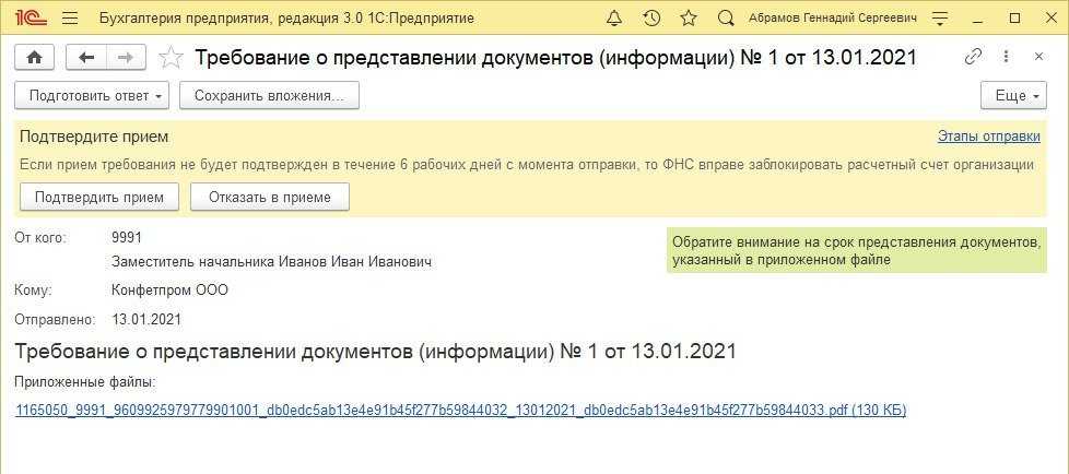 Встроенный в программы 1С сервис 1С-Отчетность позволяет не только отправлять регламентированную отчетность в контролирующие органы, но и обеспечивает получение от них документов в электронной форме, а также предоставляет удобные инструменты подготовки ответа на требования ФНС, в том числе и на требование о представлении документов (информации).
