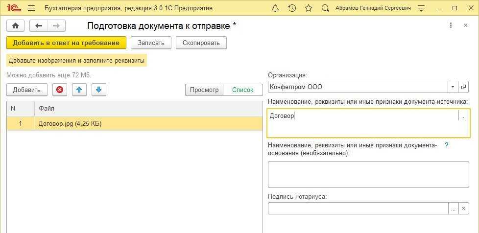 После заполнения обязательного описания документа следует нажать на кнопку Добавить в ответ на требование (рис. 7).