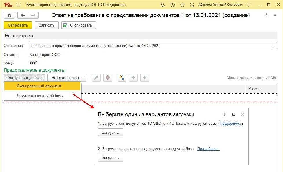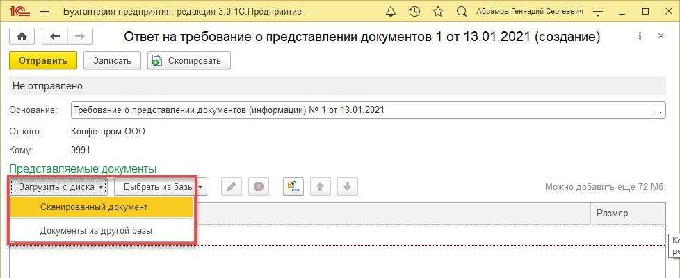 Если xml-документы или сканированные документы, которые необходимо отправить в ответ на требование ИФНС, находятся в другой информационной базе, то их можно выгрузить из этой базы в специальный архивный файл (файл обмена), а затем загрузить в ту информационную базу, откуда готовится ответ на требование.