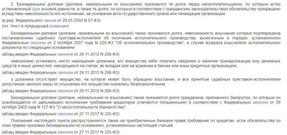 На основании НК РФ безнадежными долгами (долгами, нереальными к взысканию) признаются долги перед налогоплательщиком, по которым, в частности:
