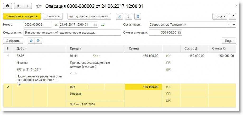Сумму погашенной задолженности необходимо включить в состав прочих доходов организации, а также списать с забалансового счета 007. Указанные операции можно отразить в одном документе Операция (см. рис. 4).