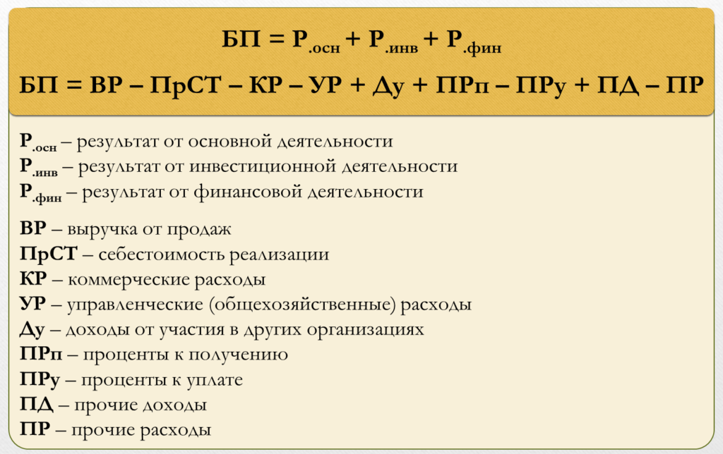 В целях расчета берутся данные отчета о финансовых результатах. Формула нахождения балансовой прибыли выглядит следующим образом: