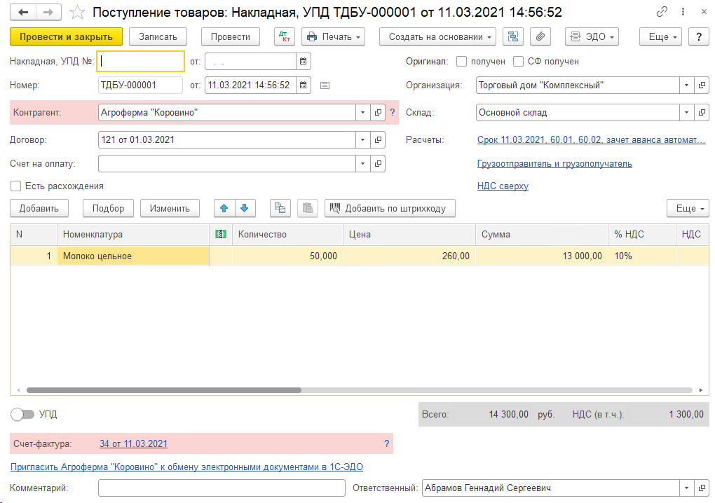 Поступившие товары отражены в программе в разделе «Покупки – Поступление» (акт, накладная, также оформлен счет-фактура).