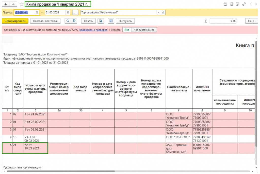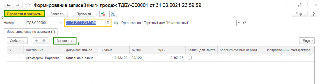 После заполнения и проведения регламентной операции «Формирование записей книги продаж» документ Счет-фактура полученный на аванс попадает в «Книгу продаж» с кодом вида операции «21», что говорит о восстановлении НДС с авансов выданных.