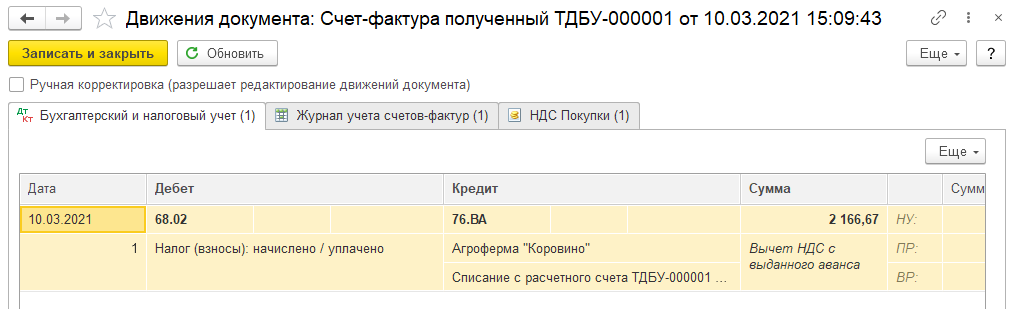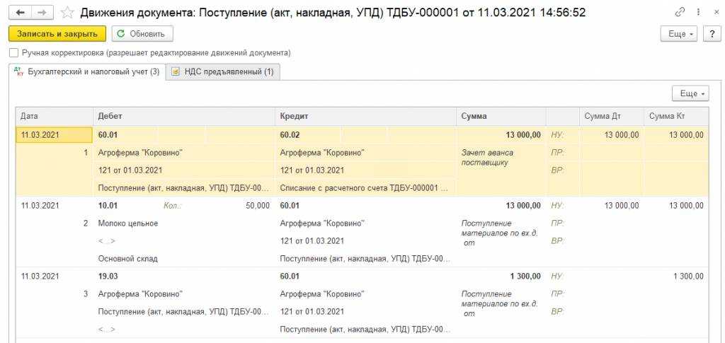После проведения данного документа происходит зачет аванса проводкой Дт 60.01 Кт 60.02.