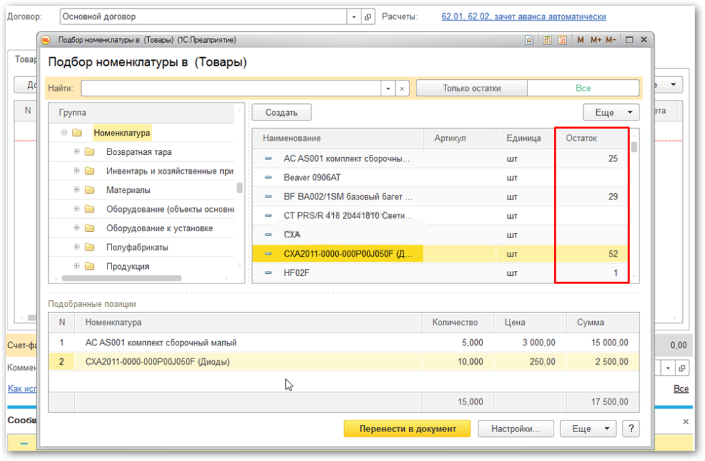 В нижней части окна отражаются выбранные и готовые к переносу в документ позиции. После того, как все нужные позиции выбраны, нажимаем «Перенести в документ».