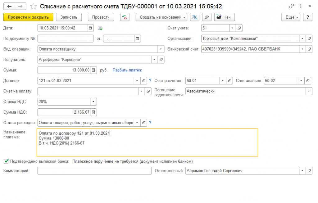 Был перечислен аванс поставщику документом «Списание с расчетного счета» (Банк и касса – Банковские выписки — Списание с расчетного счета).