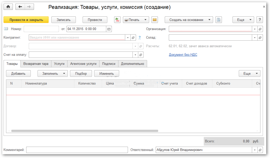 Создание и заполнение в 1С документа продажи услуг и товаров