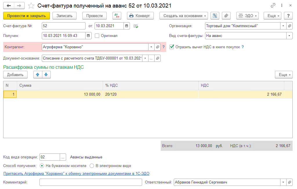 Проведение документа «Поступление товаров» и регистрация «Счета-фактуры» является зачетом аванса. В данном случае документ «Счет-фактура» попадает в «Книгу покупок» с кодом вида операции 01 «Получение товаров, работ, услуг».