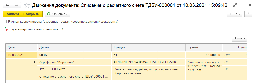 Теперь документ можно провести. При проведении сформируются проводки, которые отразят факт реализации товара в бухгалтерском учете.