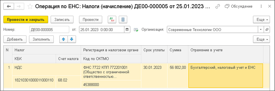 Не позднее 30.01.2023 (28.01.2023 приходится на выходной день) необходимо уплатить одну треть от суммы исчисленного по данным декларации НДС (п. 1 ст. 174, п. 7 ст. 6.1 НК РФ). Для корректного ведения учета задолженность перед бюджетом по НДС по сроку уплаты 30.01.2023 необходимо перенести на ЕНС. Для этого используется документ Операция по ЕНС с видом Налоги (начисление). Такой документ можно сформировать автоматически при выполнении задачи по уплате НДС.