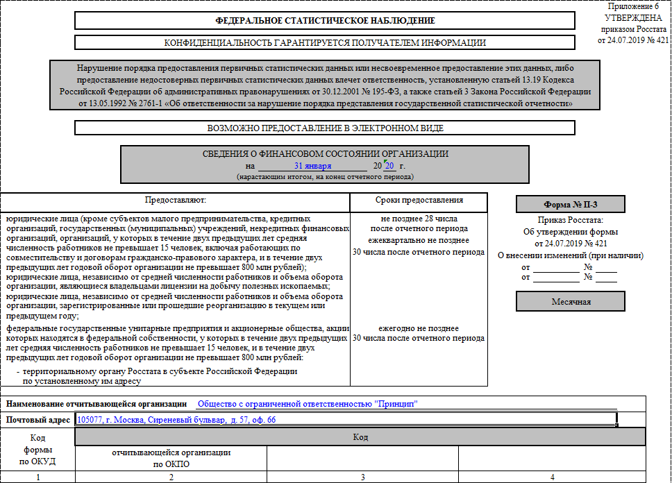 | П-3 «Финансовое состояние организации» | 28 число следующего месяца | Приказ №421 от 24.07.2019 |