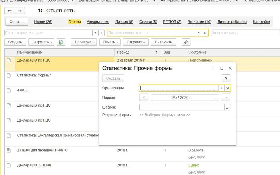 создать новый отчет: в меню «Отчеты» → «Регламентированные отчеты» → «Создать»; в разделе «Статистика» выбрать пункт «Статистика: Прочие формы»;
