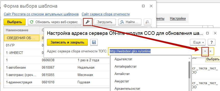 указать свой регион: в окне «Форма выбора шаблона» нажать на значок настроек, в меню «Настройка адреса сервера ССО» в строке «Адрес сервера сбора отчетности ТОГС» выбрать свой регион из списка;