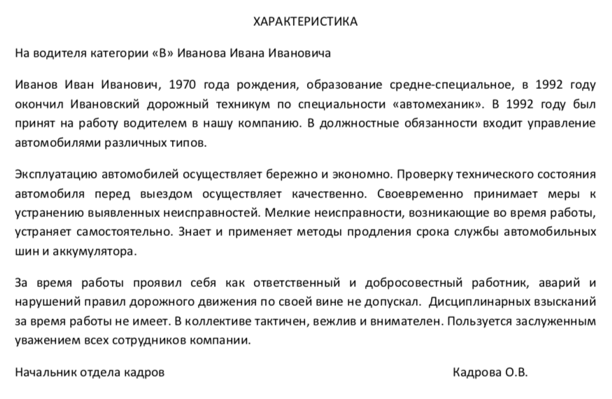 Указывается, каков водительский стаж гражданина, какие личные качества позитивно влияют на работу (например, пунктуальность, ответственность, уравновешенность, бесконфликтность), какие мешают (частые опоздания, склочный характер и т.д.).