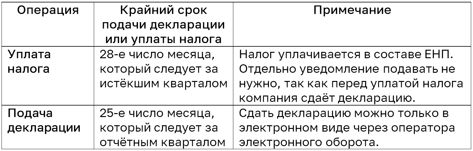 Если компания выступает в роли налогового агента, она должна самостоятельно выставить счёт-фактуру самой себе от имени продавца и зафиксировать такой документ в книге продаж. Кроме того покупатель должен сдать декларацию по НДС и уплатить налог в бюджет в следующие сроки: