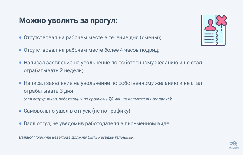 Для начала определимся с понятием. Прогул — это отсутствие без уважительной причины на рабочем месте в течение рабочего дня или смены от четырех и более часов подряд, в которые не входит обеденный перерыв (пп. «а» п. 6 ст. 81 ТК РФ). Помните, что есть ограничения. Нельзя уволить: