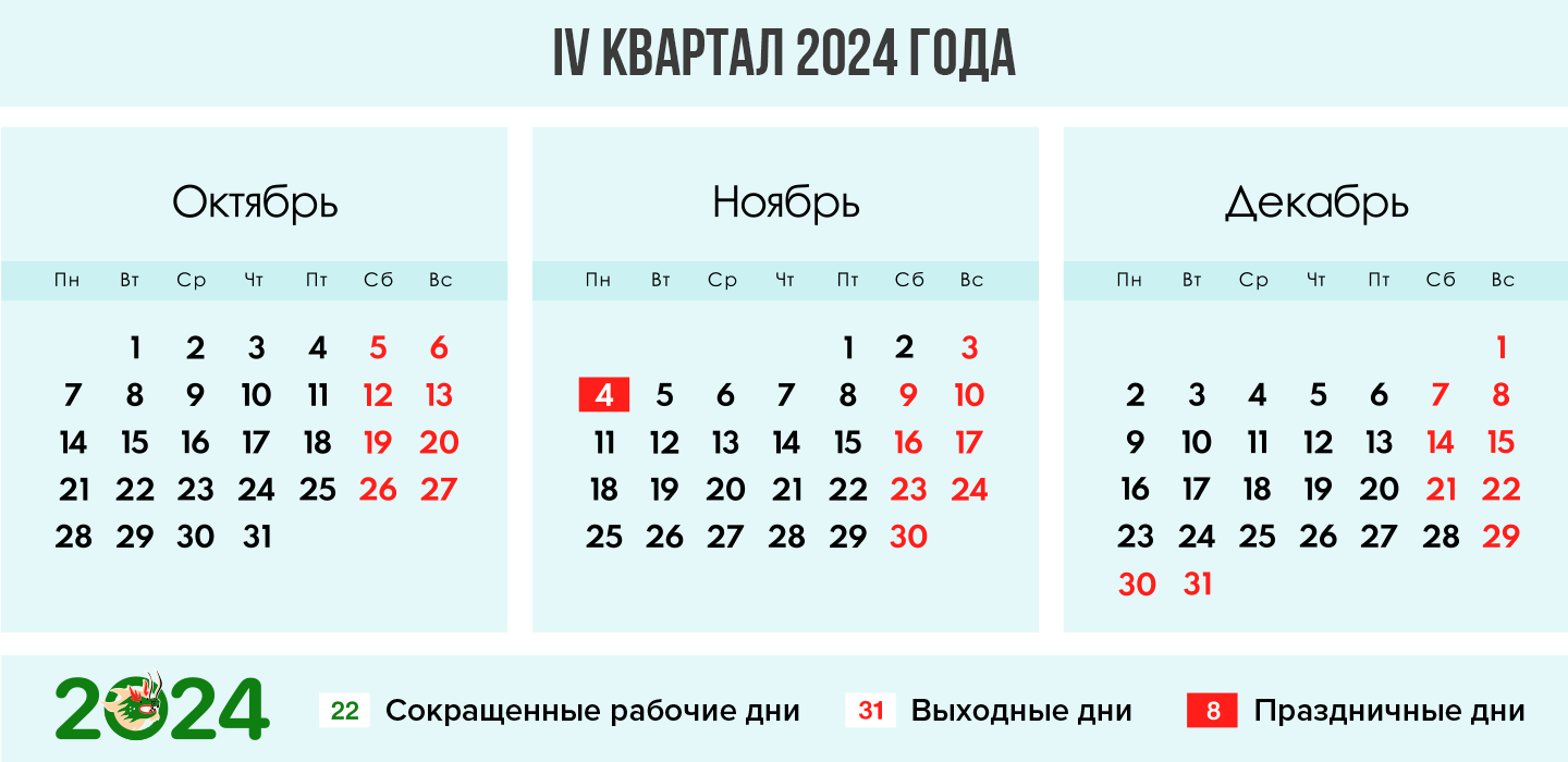 В четвертом квартале буде 92 календарных дня, среди которых 65 рабочих (сокращенных рабочих дней нет) и 27 выходных.