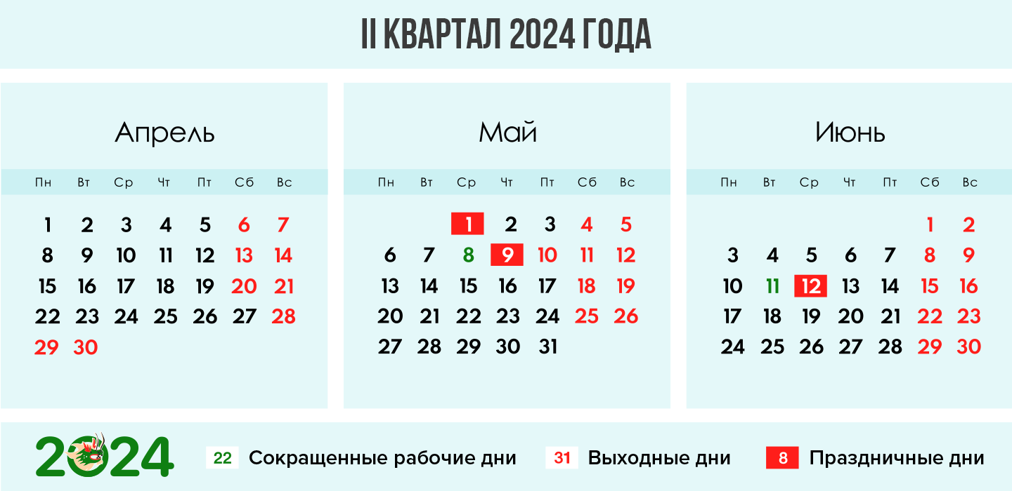 Во втором квартале (апрель, май, июнь) календарь на 2024 год устанавливает такой график праздничных и выходных дней. Всего – 91 календарный день, рабочих – 60 (из них 2 сокращенных), выходных – 31.