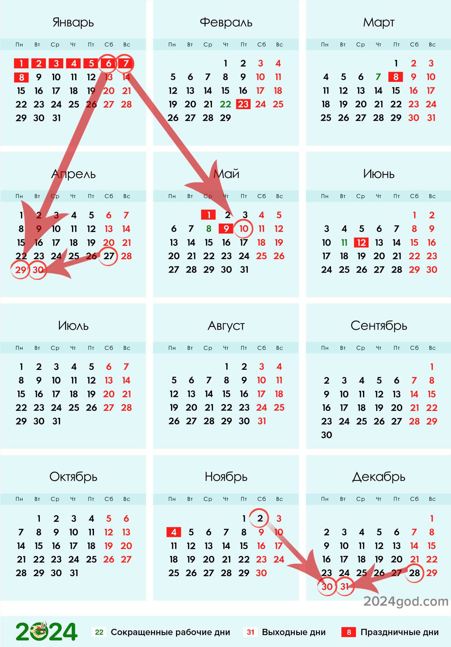 Таким образом, при 5-днейной рабочей неделе в 2024 году нас ожидают следующие выходные и праздничные дни: