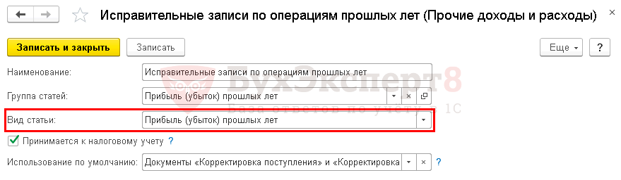 Сумма корректировки при выбранной статье Исправительные записи по операциям прошлых лет отразится в стр. 300 (301) декларации по налогу на прибыль.