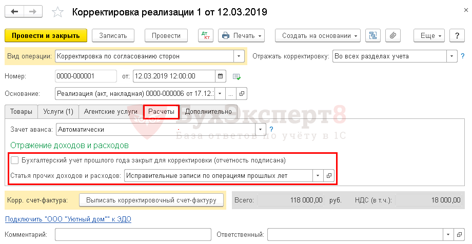 Если флажок Бухгалтерский учет прошлого года закрыт для корректировки (отчетность подписана) не установлен, то в 1С корректируется:
