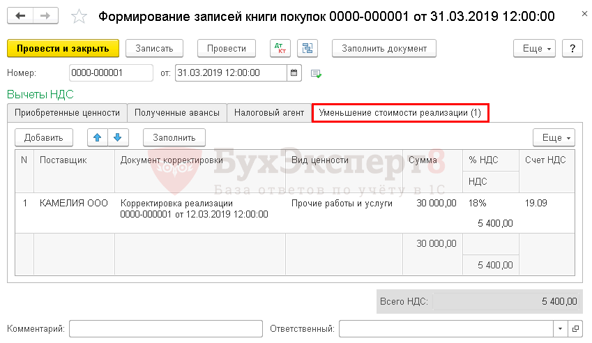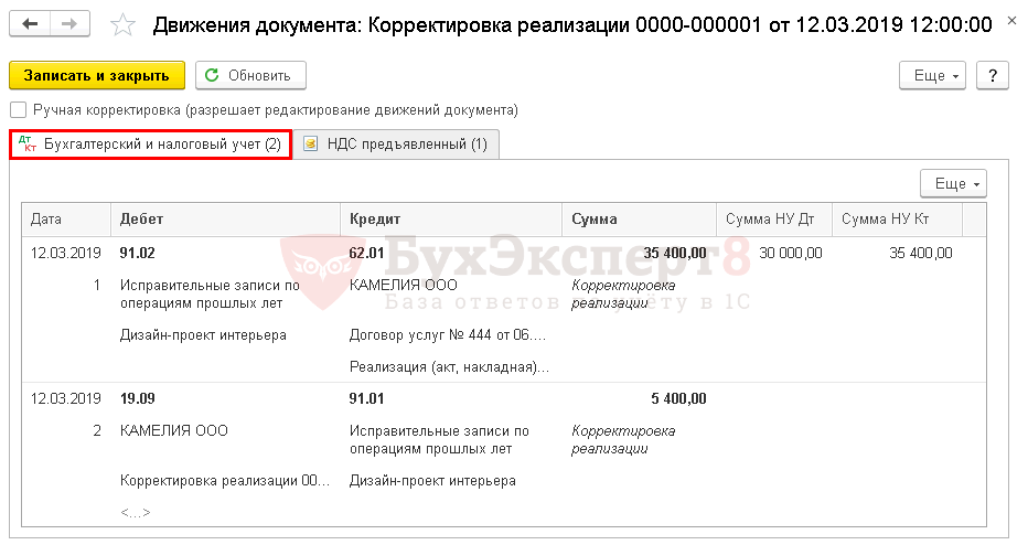 Корректировка реализации отражается на вкладке Уменьшение стоимости реализации.