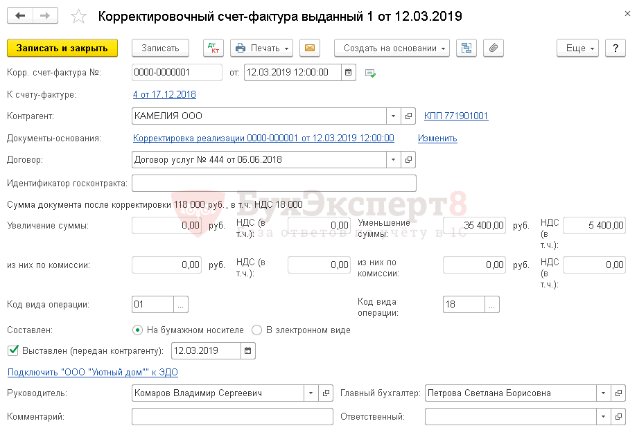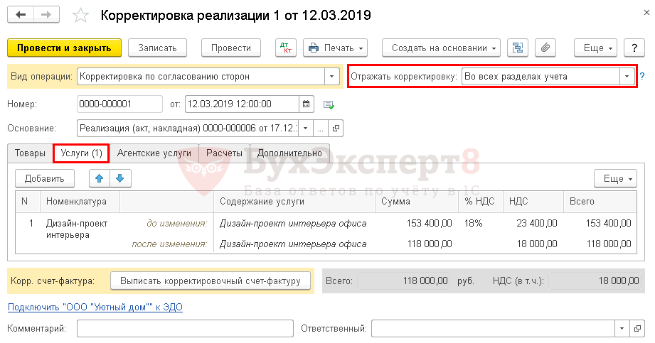 12 марта по согласованию сторон предоставлена ретро-скидка на оказание услуг от 17 декабря. Бухгалтер выставил корректировочный счет-фактуру на сумму 118 000 руб.