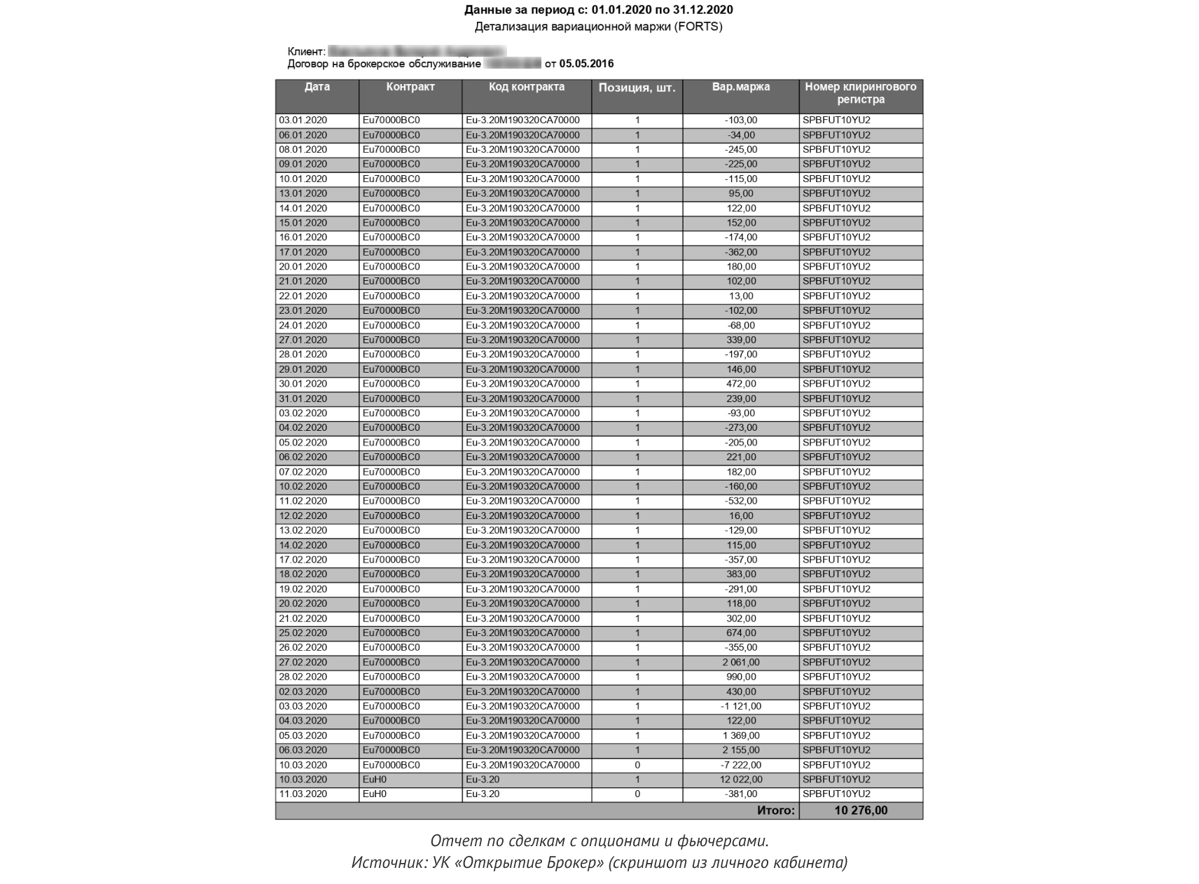 Отчеты по производным инструментам (фьючерсам, опционам), как правило, выведены в отдельную таблицу или даже целый документ, где показан размер гарантийного обеспечения и вариационной маржи. Если она положительная, то в текущий момент у вас сформировалась прибыль, если отрицательная — убыток. Несмотря на сложность в понимании самого инструмента, это самая простая часть брокерского отчета: она выглядит как ежедневное изменение остатка на накопительном счете — таблица из идущих друг за другом торговых дней с суммой денег на установленный час дня.