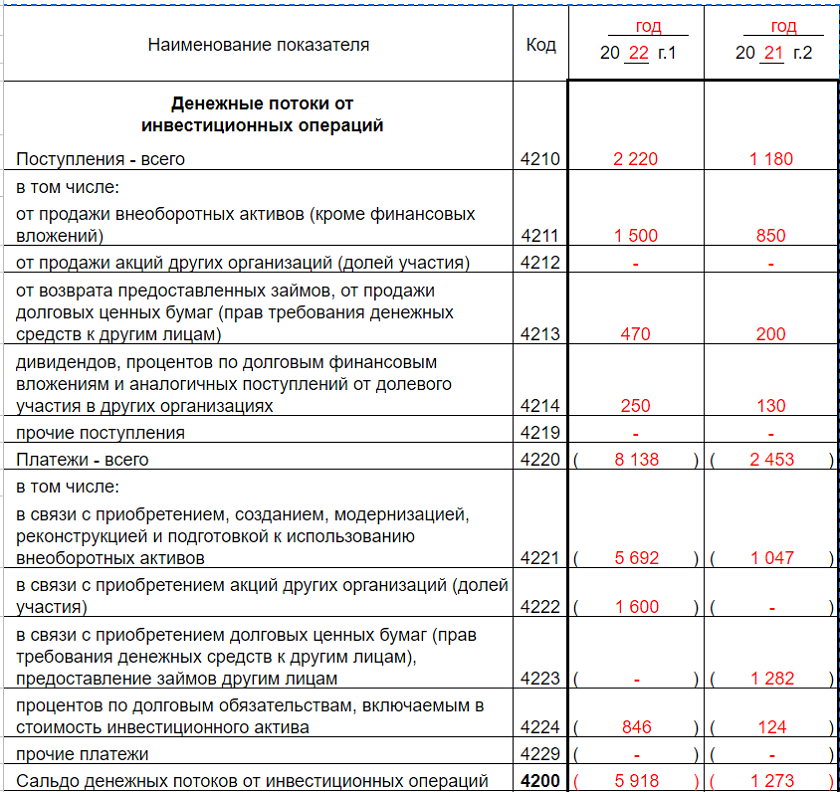В составе инвестиционных операций учитывают поступления от продажи внеоборотных активов, акций других организаций, возврата займов, дивиденды и проценты, прочие поступления (строки 4210-4219). А к выплатам инвестиционного характера относят платежи на приобретение внеоборотных активов, акций других компаний, долговых ценных бумаг, проценты по долговым обязательствам и другие расходы (строки 4220-4229). Сальдо денежных потоков от инвестиционных операций фиксируют в строке 4200.