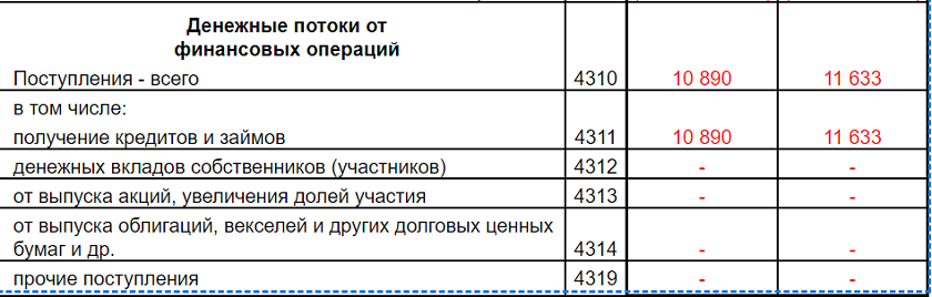 Поступление от финансовых операций в строках 4310-4319 — это получение кредитов, денежные вклады собственников, выпуск акций и облигаций, прочие поступления.