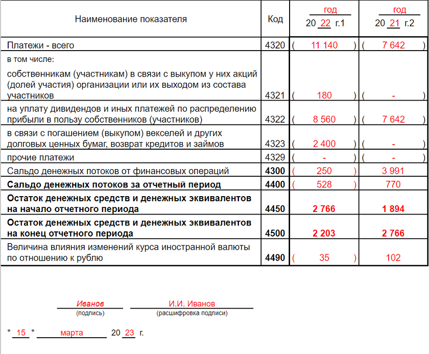 - в строке 4400 — сальдо денежных потоков за отчетный период;