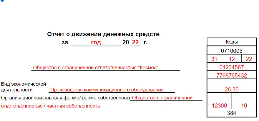 Формирование отчета о ДДСр начинается с заполнения «шапки». В ней отражается информация о периоде, наименование и основные характеристики компании, а также прописываются единицы измерения, в которых отражен финансовый результат.