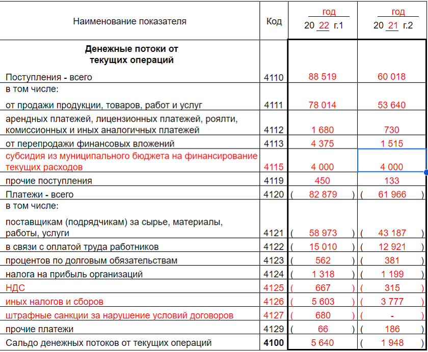 Далее в строку 4100 вносится показатель сальдо от текущих операций (т.е. сумма «входящих» финансов за минусом произведенных расходов). В этот же раздел вписываются сведения о денежных перечислениях и поступлениях, которые нельзя однозначно классифицировать.