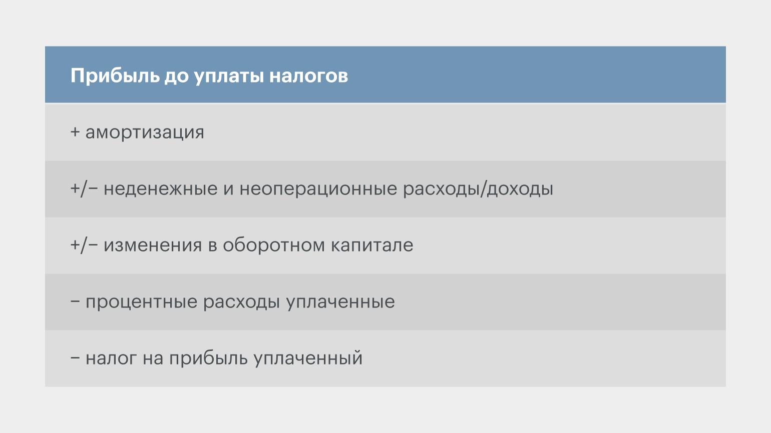 Из этого значения компания вычитает налог на прибыль — сумму, которую фактически заплатили в прошедшем периоде, — и получает результат: чистый денежный поток по операционной деятельности.