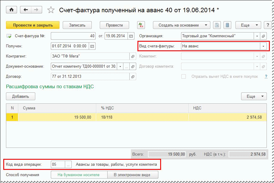 Регистрация перевыставленного авансового счета-фактуры от комитента