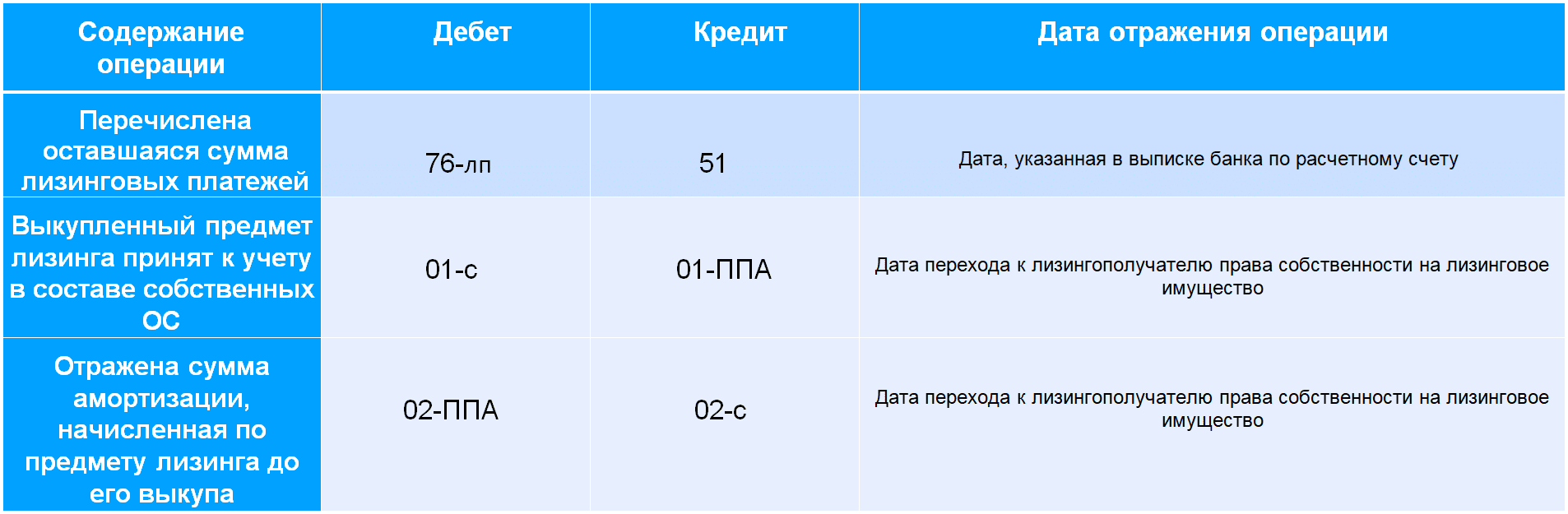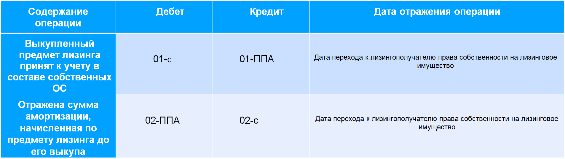 В случае лизинга выкупную стоимость лизингового имущества в качестве отдельного расхода признавать не нужно, даже если она выделена в договоре. Это обусловлено тем, что выкупная цена формирует общую сумму лизинговых платежей и, соответственно, в течение срока лизинга учитывается в расходах через амортизацию права пользования активом (ППА). После истечения срока и уплаты всей суммы лизинговых платежей обязательство по лизингу полностью погашается, и к вам переходит право собственности на предмет лизинга. В связи с этим включите лизинговое имущество в состав собственных ОС, спишите с учета ППА и начисленную по нему амортизацию. В бухучете такая операция отражается в аналитике по счетам 01 «Основные средства» и 02 «Амортизация основных средств».