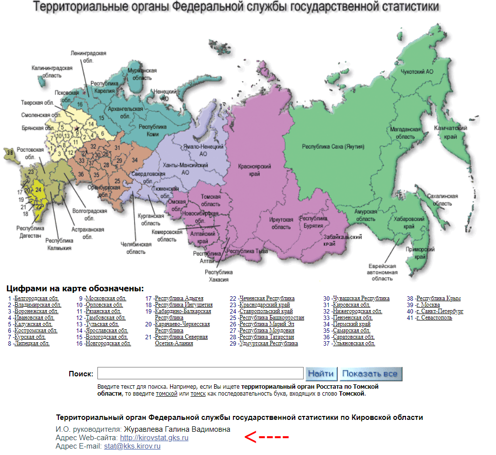Найти территориальный орган в конкретном субъекте РФ поможет карта на официальном сайте gks.ru . При нажатии на название нужной области внизу страницы появятся данные по территориальному органу Росстата.