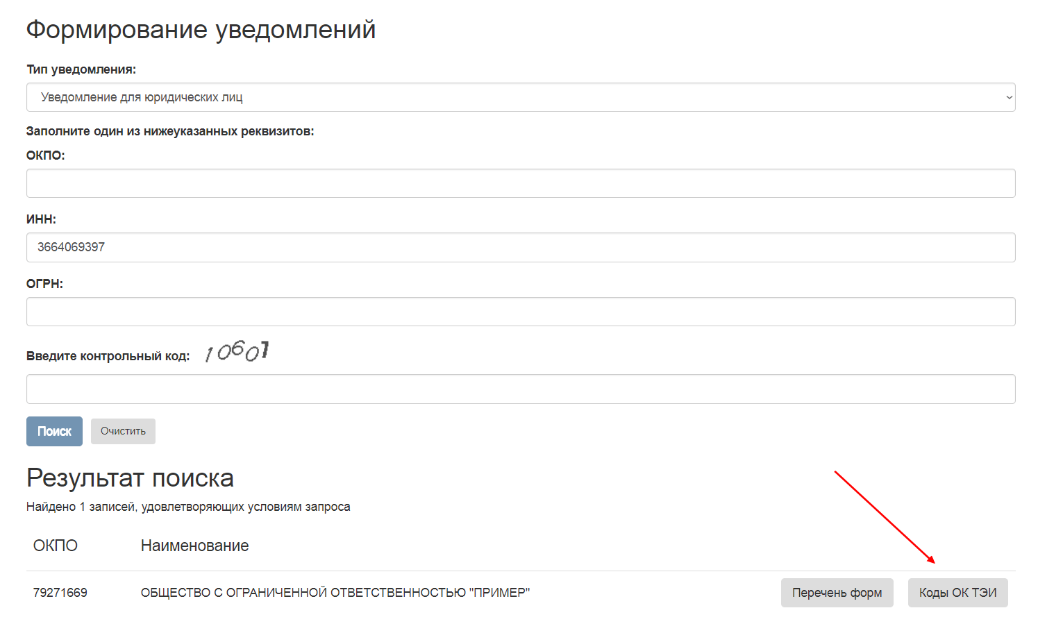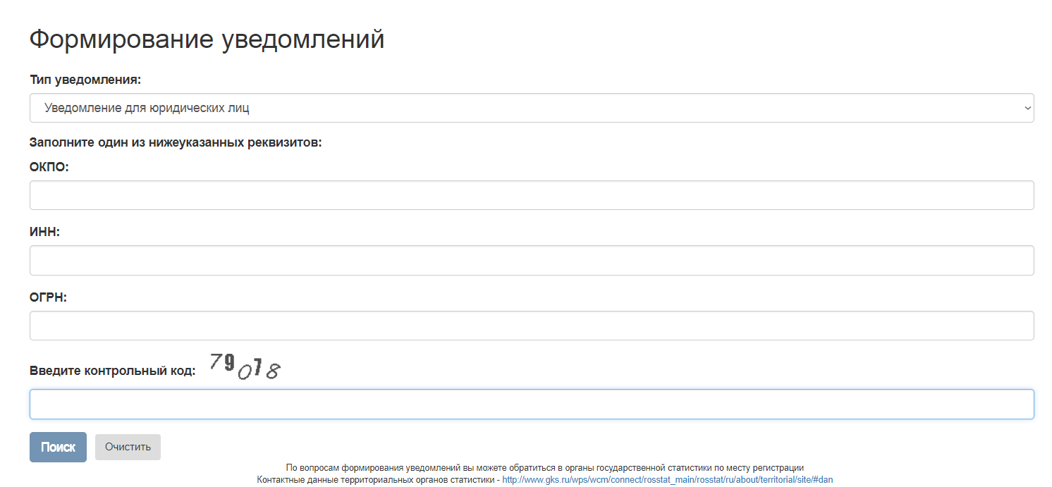 Необходимо выбрать тип уведомления, ввести ОКПО, ИНН, ОГРН или ОГРНИП, а также защитный код