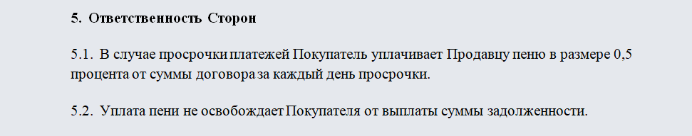 Больший риск при подобной сделке несет продавец, поэтому он вправе обезопасить себя и предусмотреть штрафные санкции за задержку очередного платежа. Процент или сумма штрафа тоже должны быть указаны в договоре.