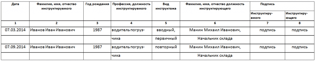 - указание Ф. И. О. и должностей инструктируемого сотрудника и инструктора, даты проведения каждого инструктажа.