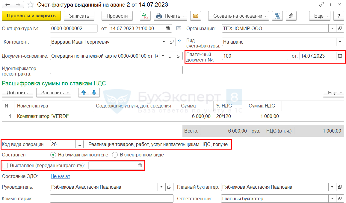 Исчисление НДС с предоплаты осуществляется документом Счет-фактура выданный вид операции На аванс на основании документа поступления оплаты — по кнопке Создать на основании — Счет-фактура выданный.