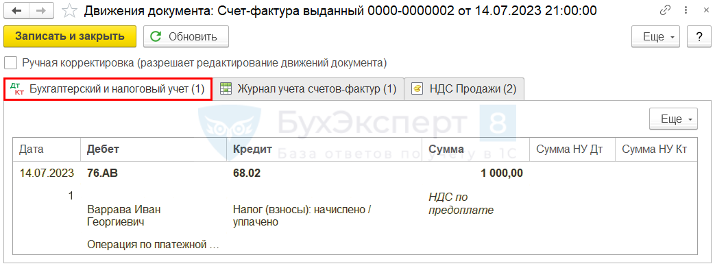 | 14 июля | 76.АВ | 68.02 | 1 000 | Исчисление НДС с аванса | Счет-фактура выданный на аванс | ||