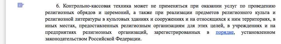 Религиозные организации также освобождены от применения онлайн-ККТ, если продают через сайт предметы культа и религиозную литературу. Пункт 6 статьи 2 54-ФЗ: