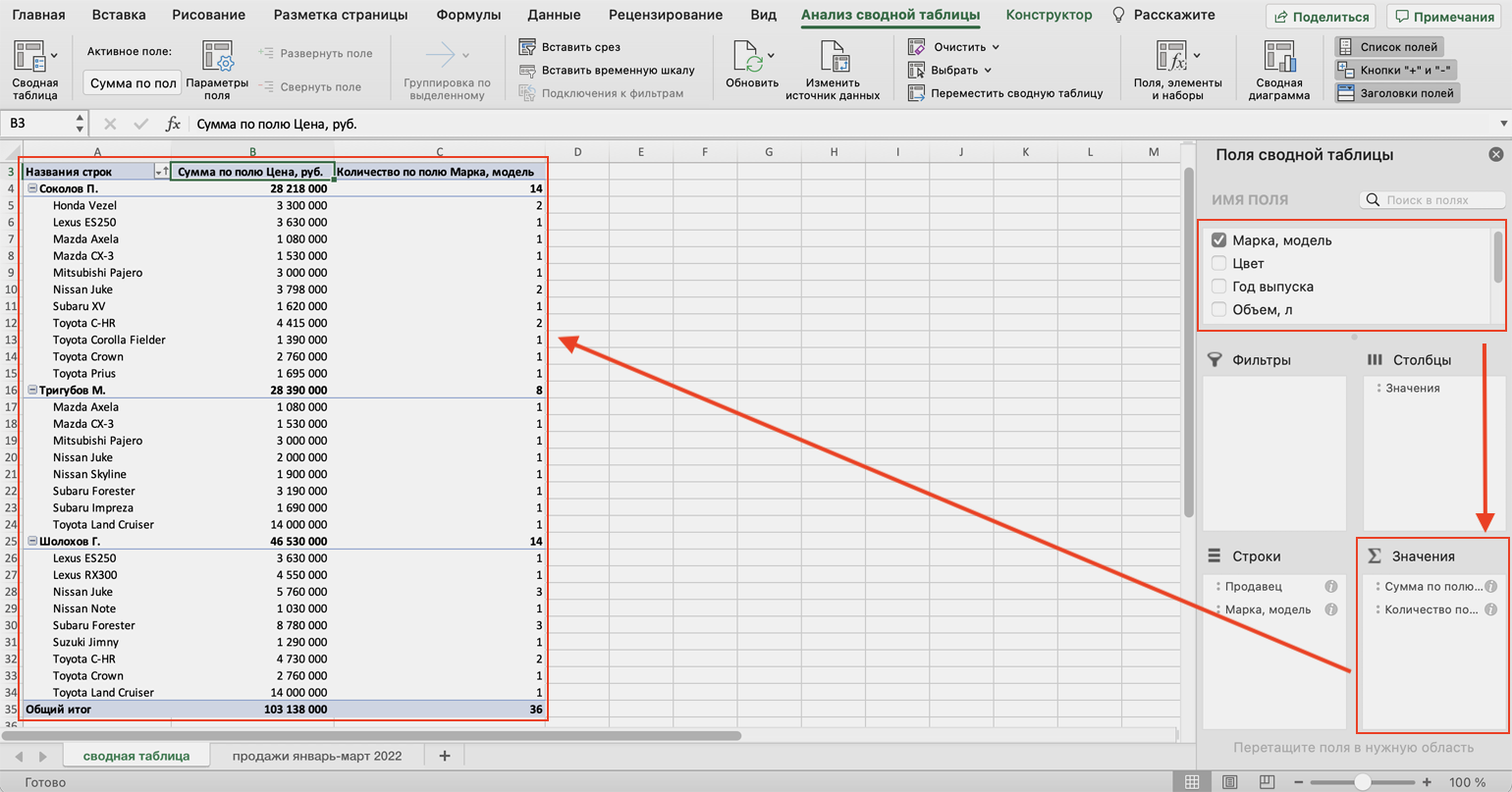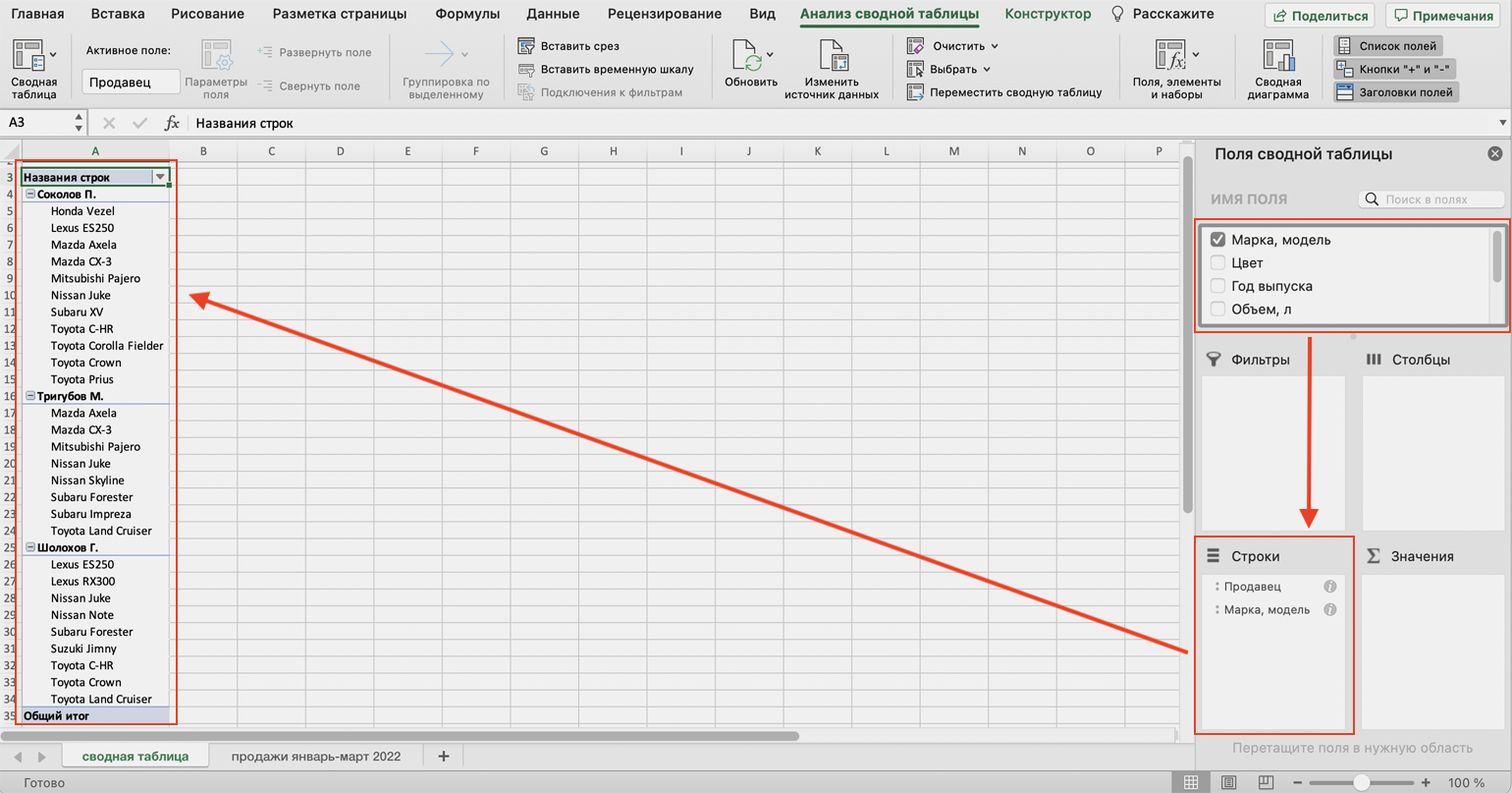 Теперь добавим модели автомобилей, которые эти менеджеры продали. По такому же принципу перетянем поле «Марка, модель» в область «Строки».