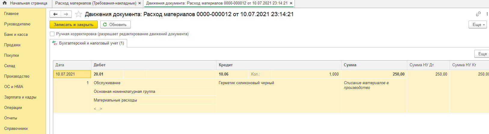 Проводки сформированы, материал списан (Кт10.06) на производственные затраты (Дт20.01).